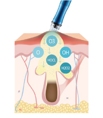 Ozone water, known for its disinfectant properties, unclogs pores by cleansing and removing bacteria, purifying the skin surface.